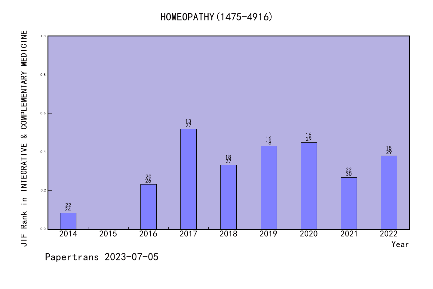 SCIE期刊Homeopathy历年派博系数(Pindex)