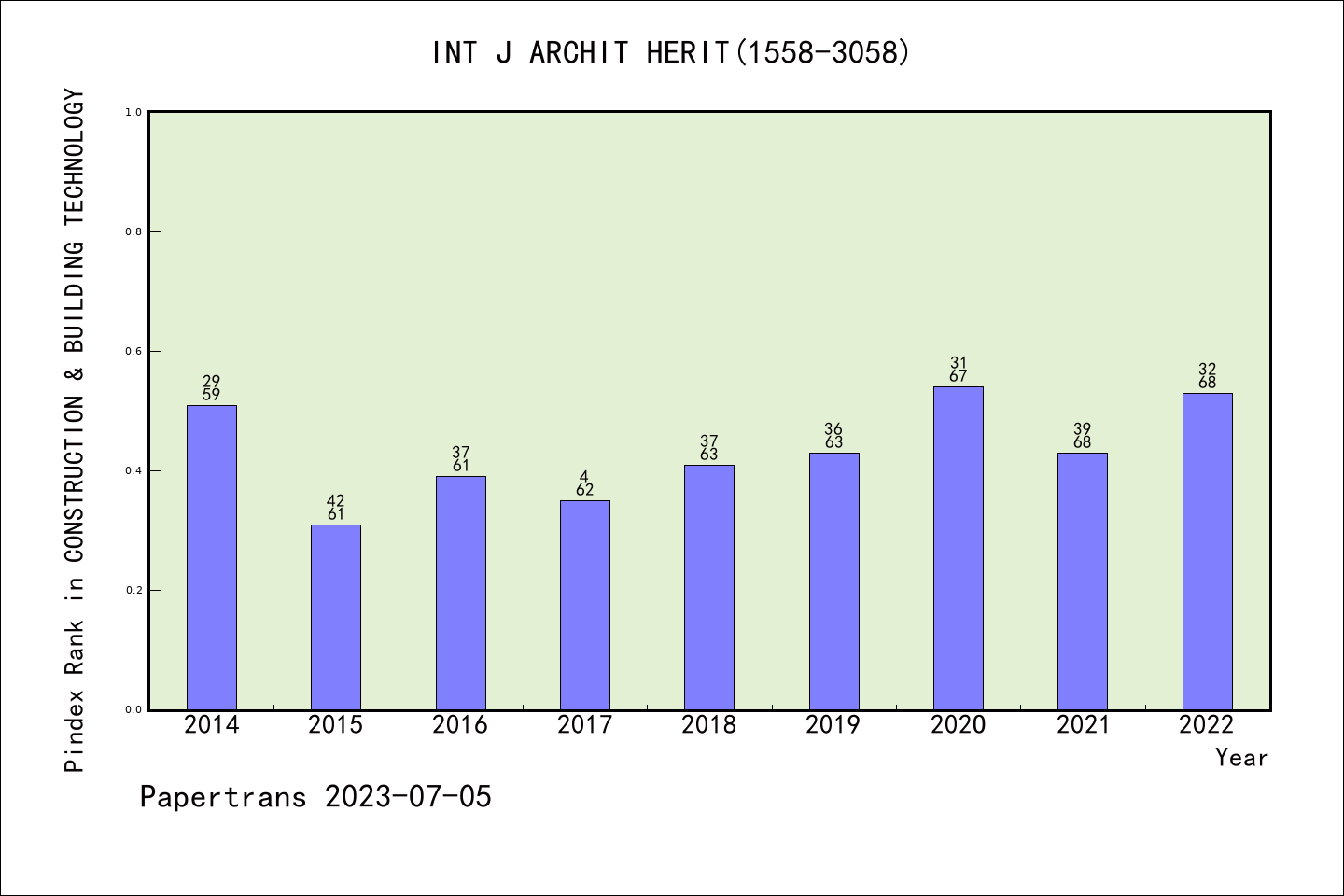 SCIE期刊International Journal of Architectural Heritage历年派博系数(Pindex)