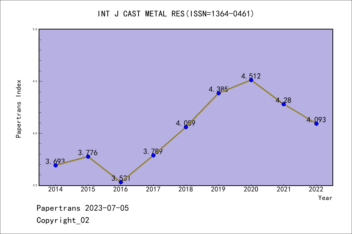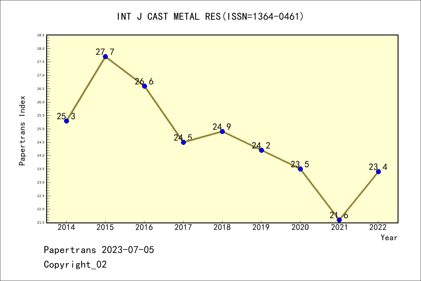 SCIE期刊INTERNATIONAL JOURNAL OF CAST METALS RESEARCH历年派博系数(Pindex)