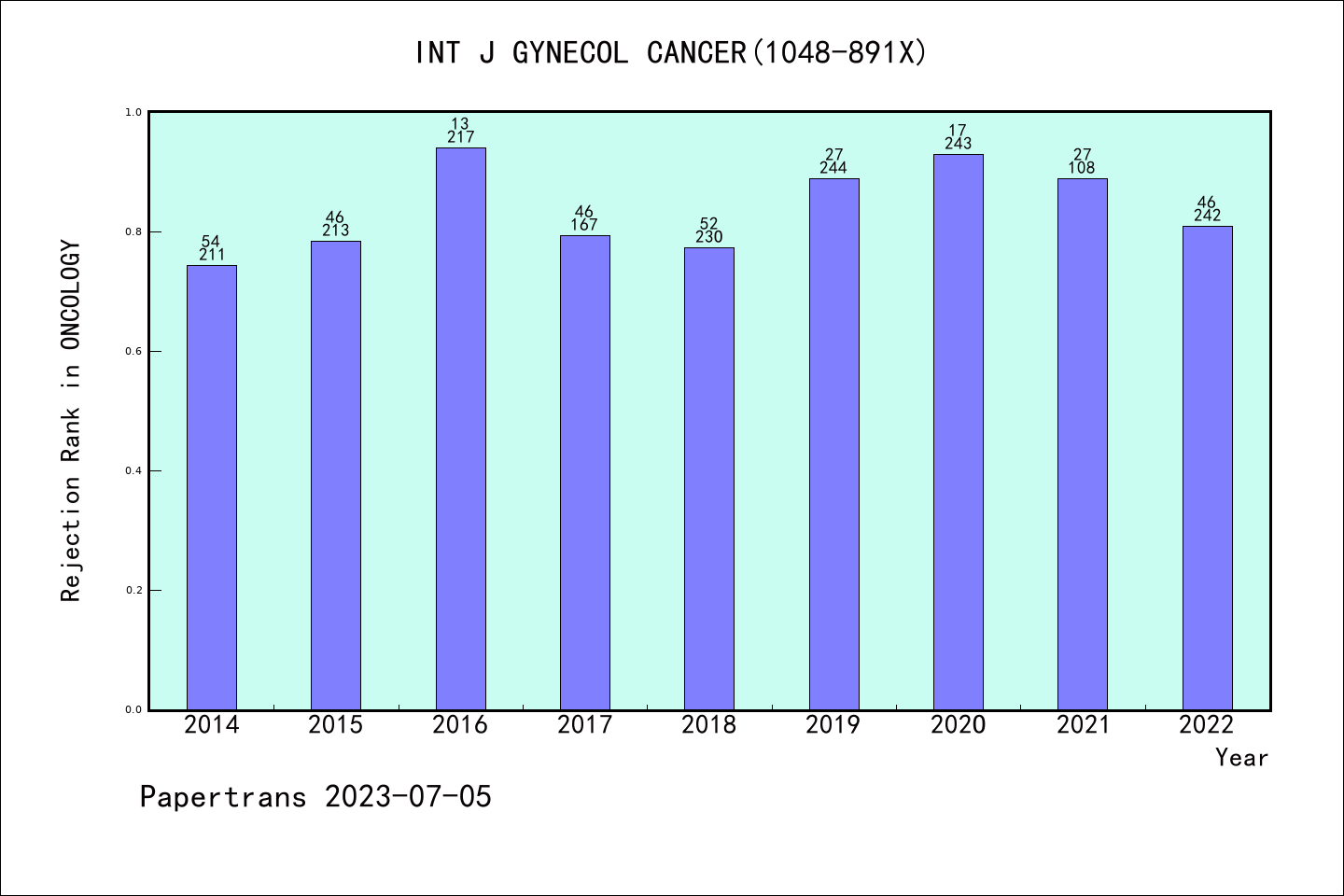SCIE期刊INTERNATIONAL JOURNAL OF GYNECOLOGICAL CANCER历年拒稿占比
