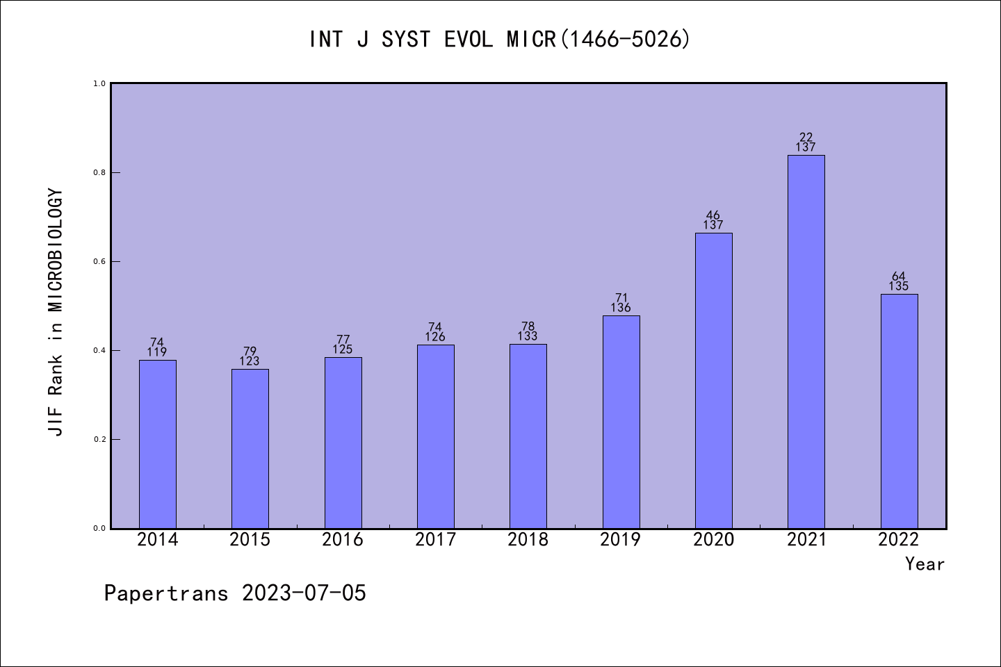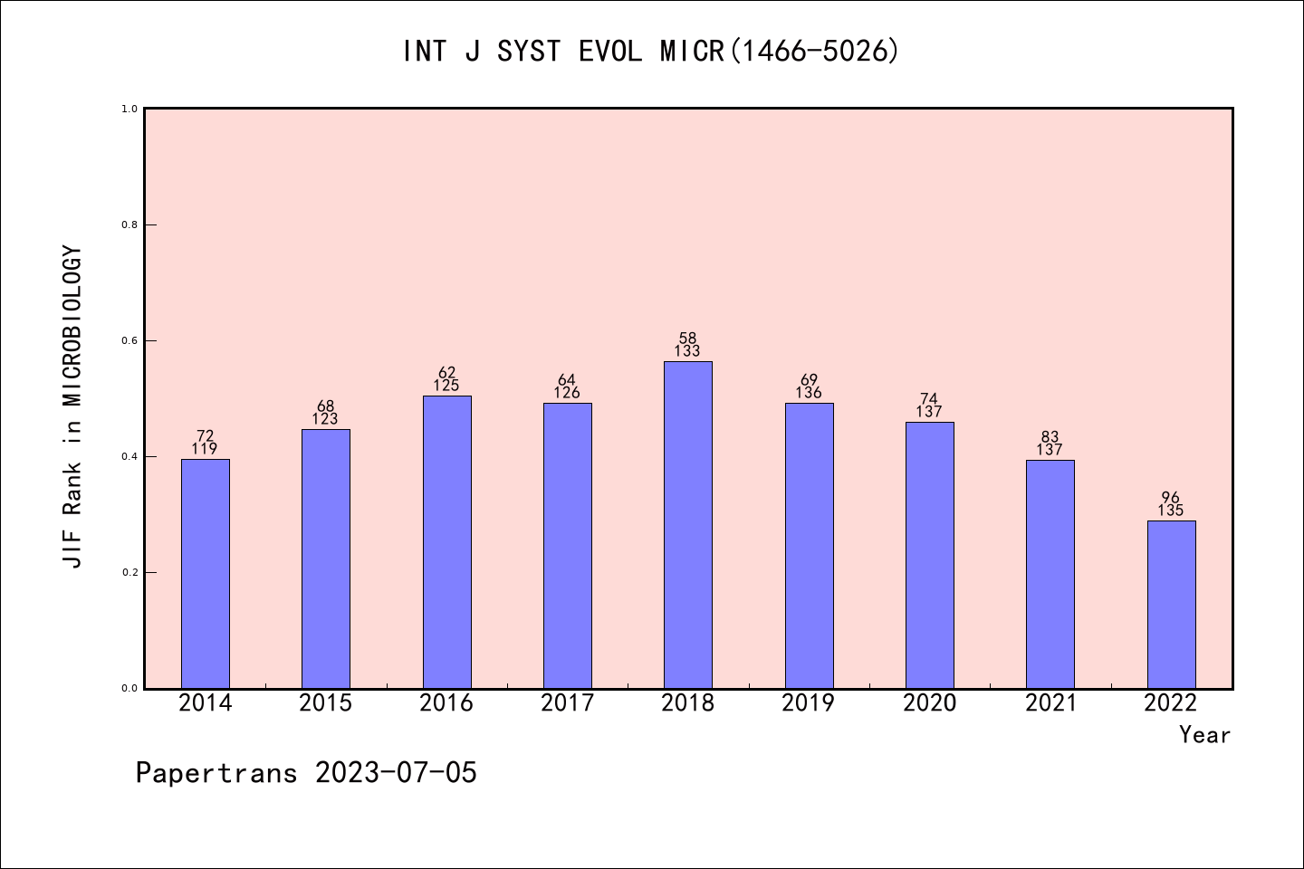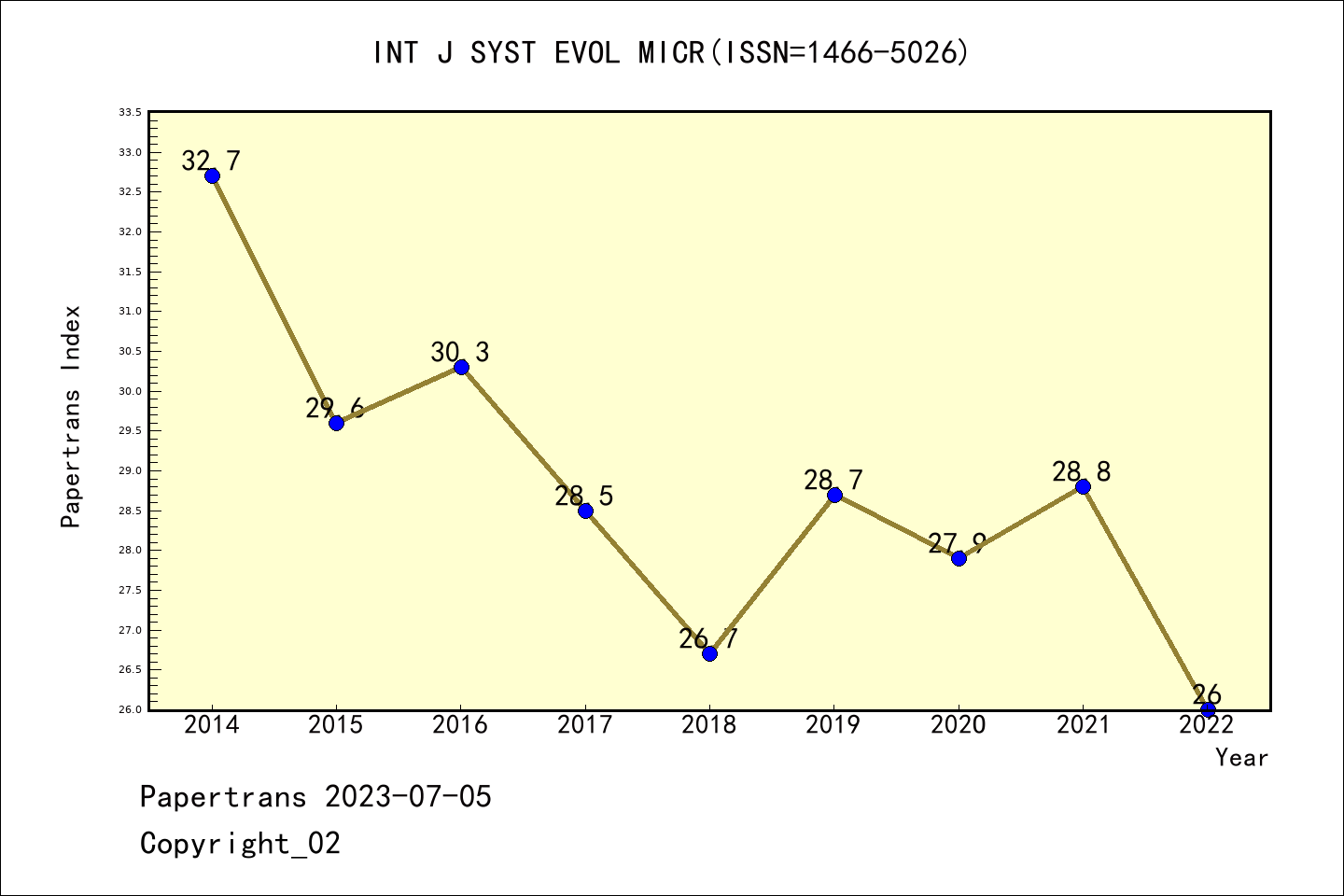 SCIE期刊INTERNATIONAL JOURNAL OF SYSTEMATIC AND EVOLUTIONARY MICROBIOLOGY历年派博系数(Pindex)