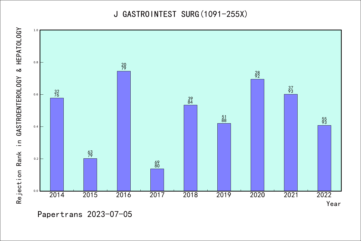 JOURNAL OF GASTROINTESTINAL SURGERY拒稿率学科排名@SCIE胃肠病与肝病
