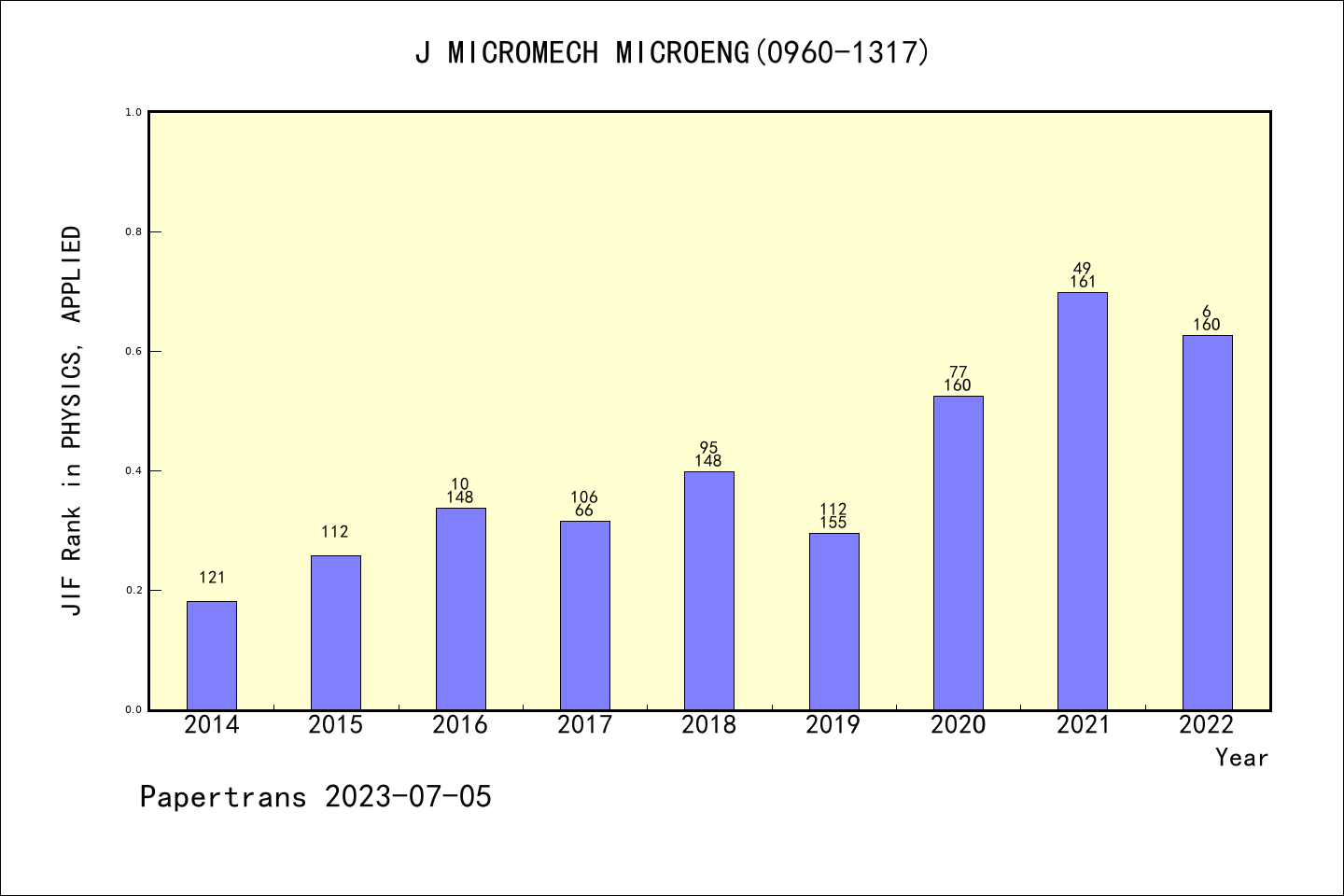 SCIE期刊JOURNAL OF MICROMECHANICS AND MICROENGINEERING历年派博系数(Pindex)