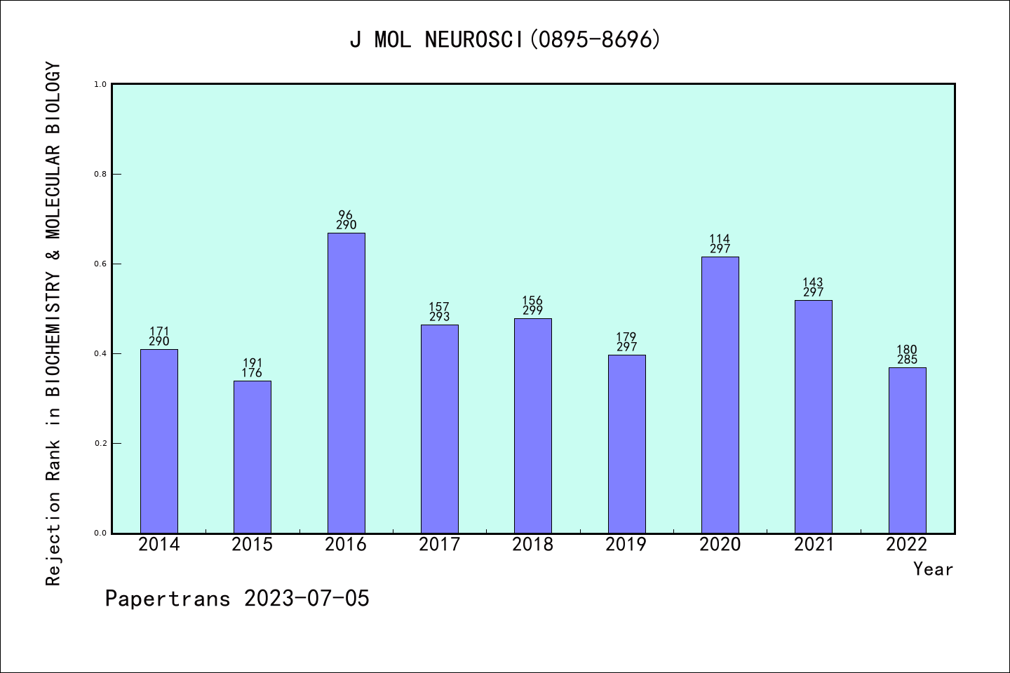 SCIE期刊JOURNAL OF MOLECULAR NEUROSCIENCE历年拒稿占比