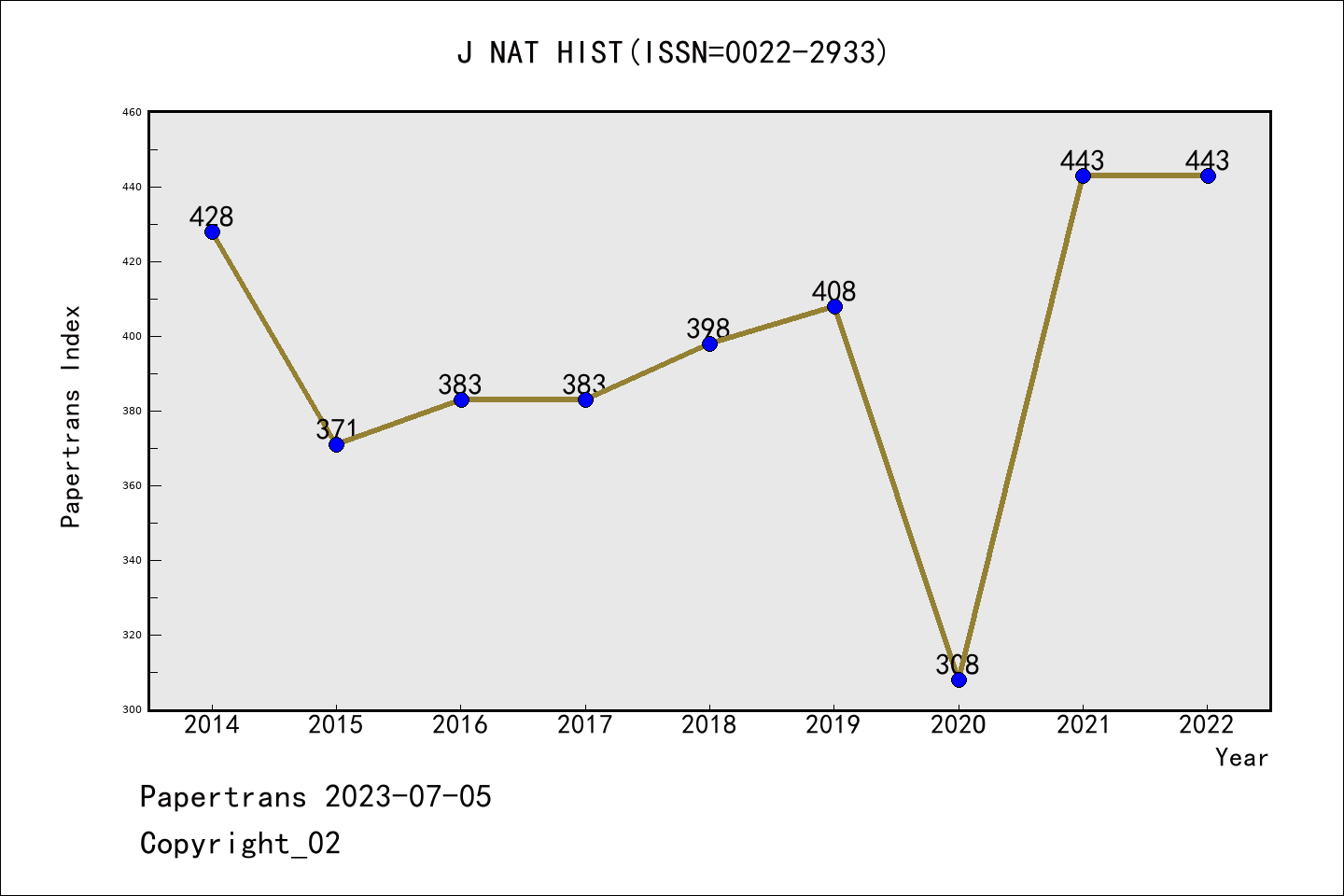 SCIE期刊JOURNAL OF NATURAL HISTORY历年派博系数(Pindex)