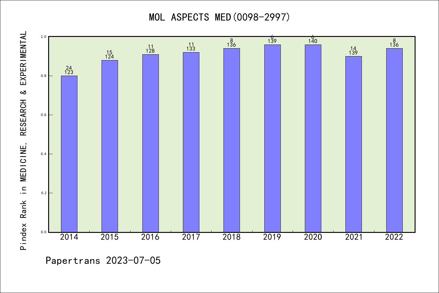 SCIE期刊MOLECULAR ASPECTS OF MEDICINE历年派博系数(Pindex)