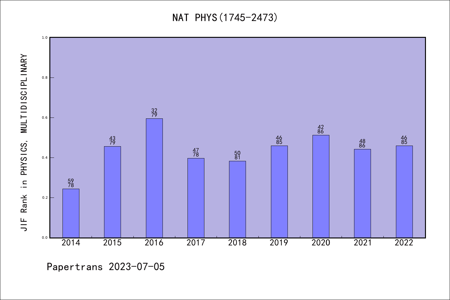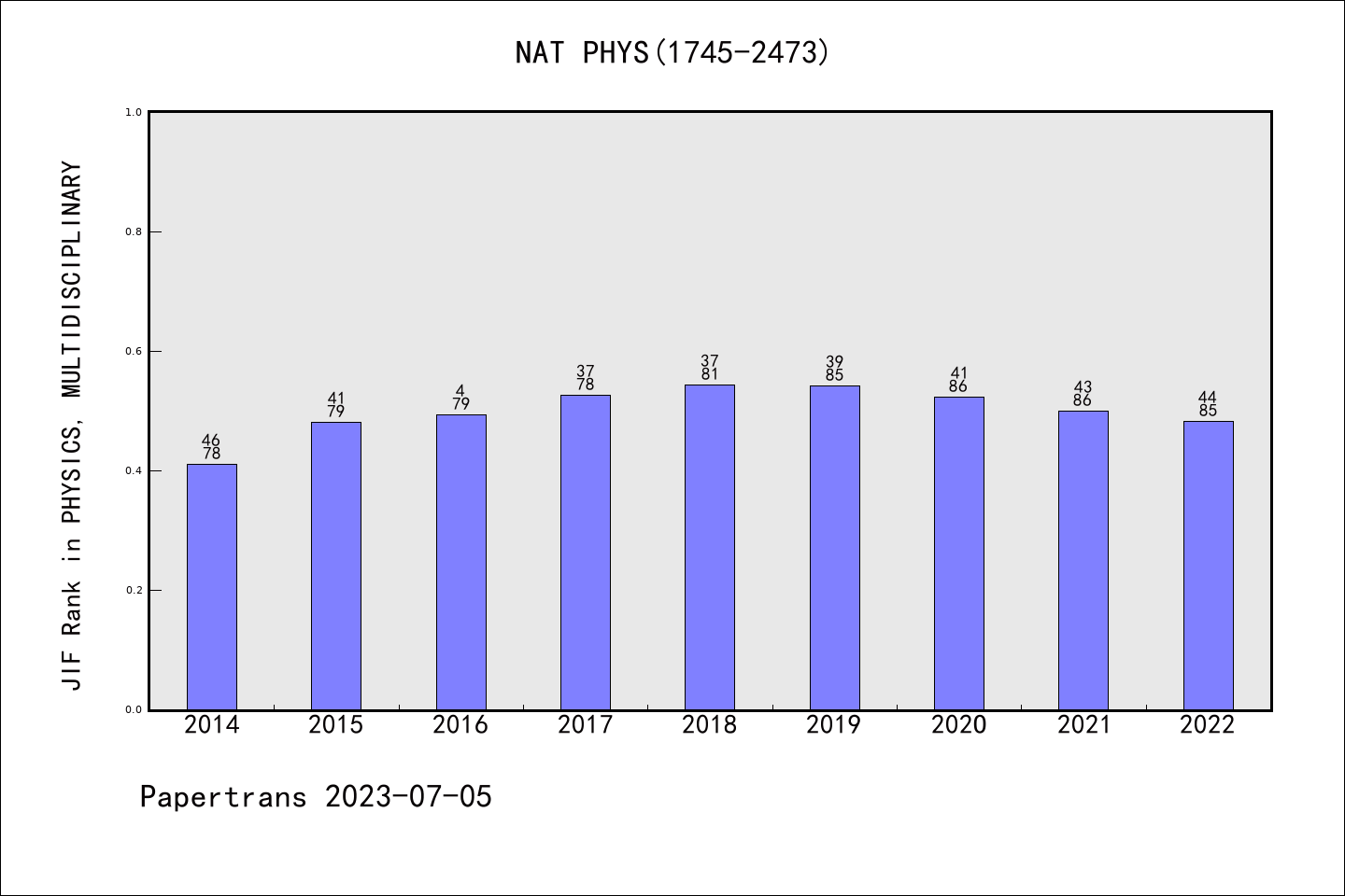 SCIE期刊Nature Physics历年派博系数(Pindex)