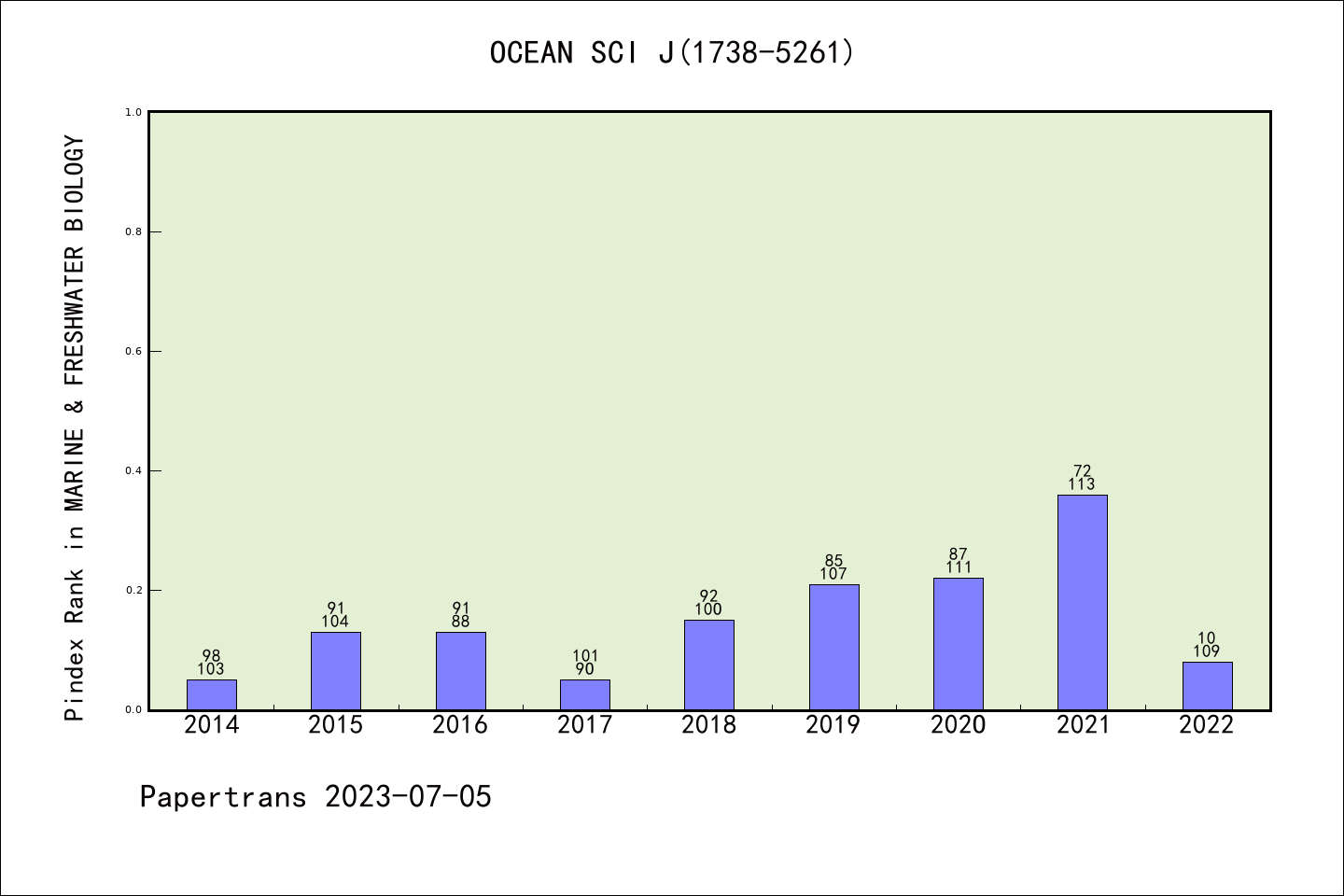 Ocean Science Journal派博系数(Pindex)学科排名@SCIE海洋与淡水生物学