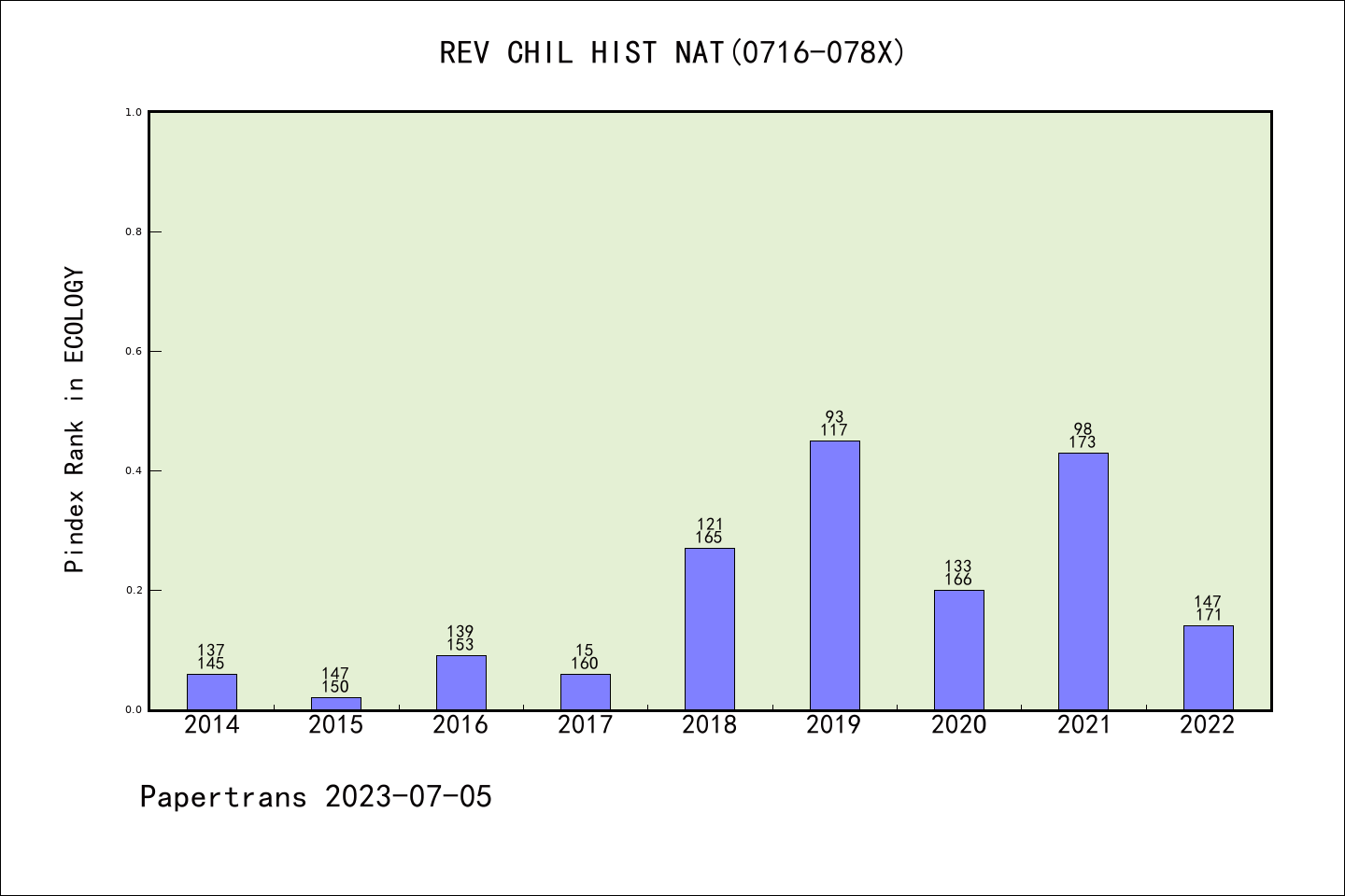 SCIE期刊REVISTA CHILENA DE HISTORIA NATURAL历年派博系数(Pindex)