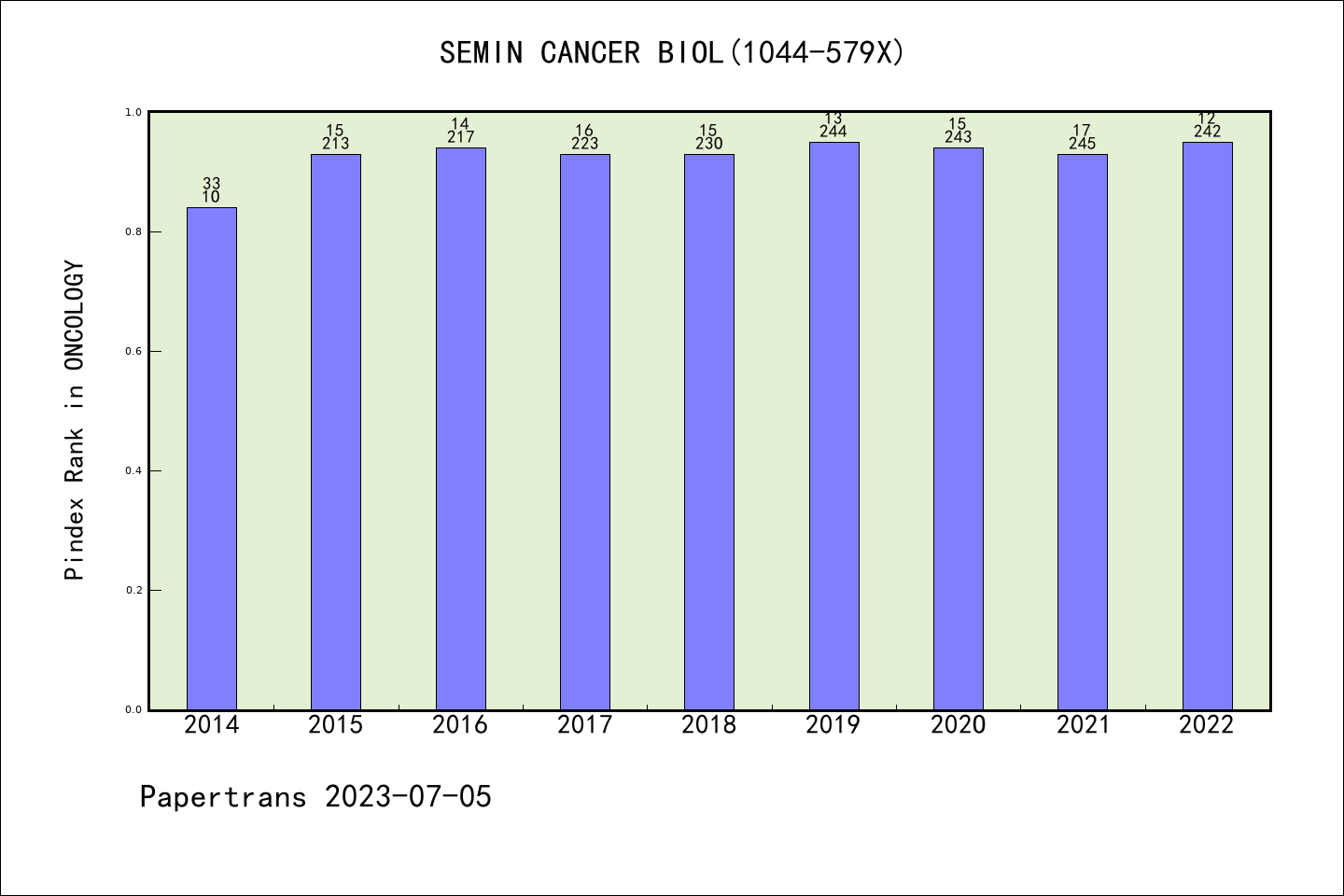 SCIE期刊SEMINARS IN CANCER BIOLOGY历年派博系数(Pindex)