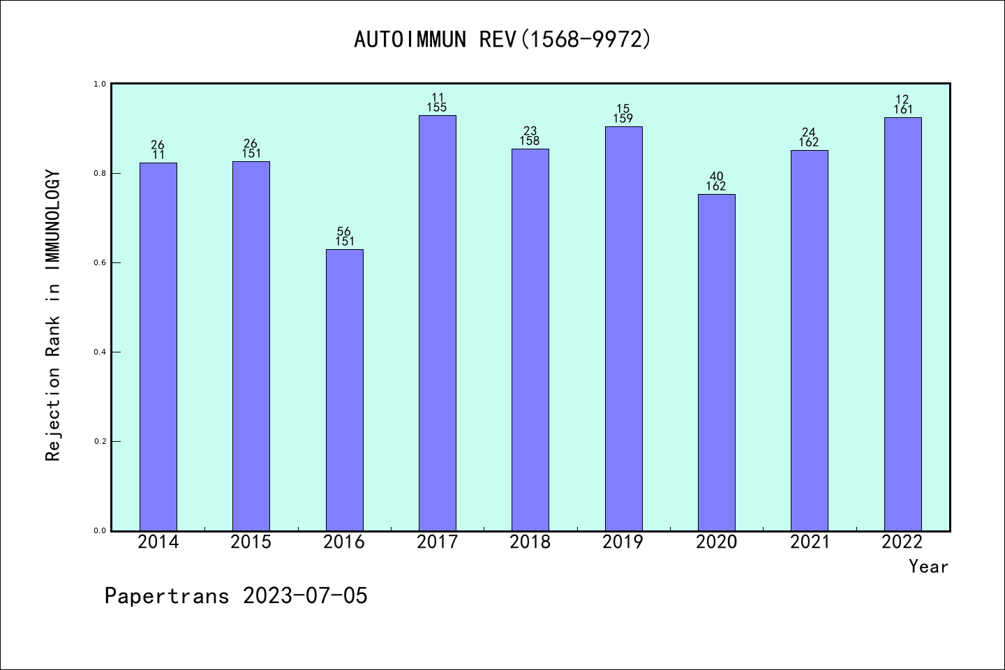 SCIE期刊AUTOIMMUNITY REVIEWS历年拒稿占比