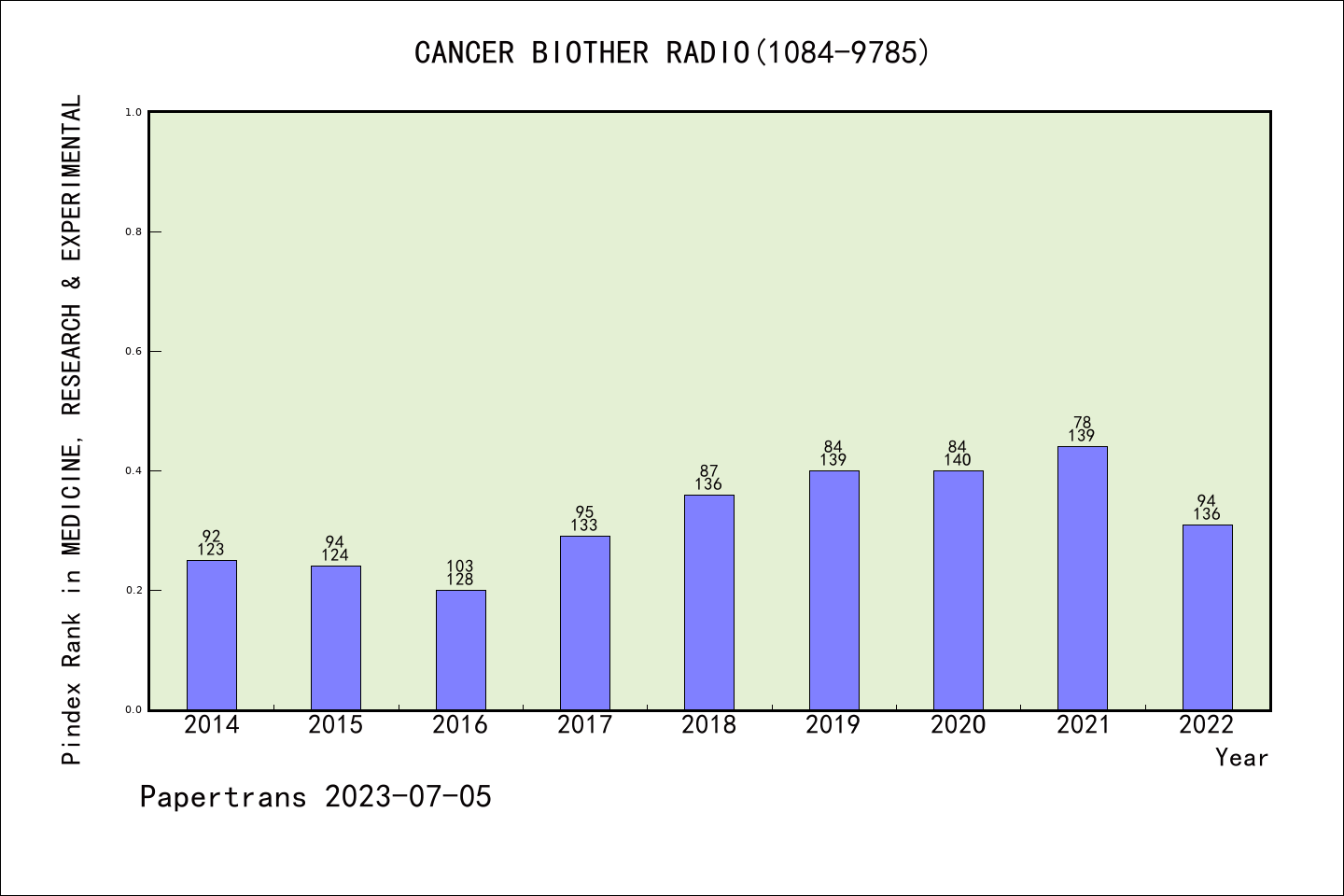 CANCER BIOTHERAPY AND RADIOPHARMACEUTICALS派博系数(Pindex)学科排名@SCIE医学研究与实验