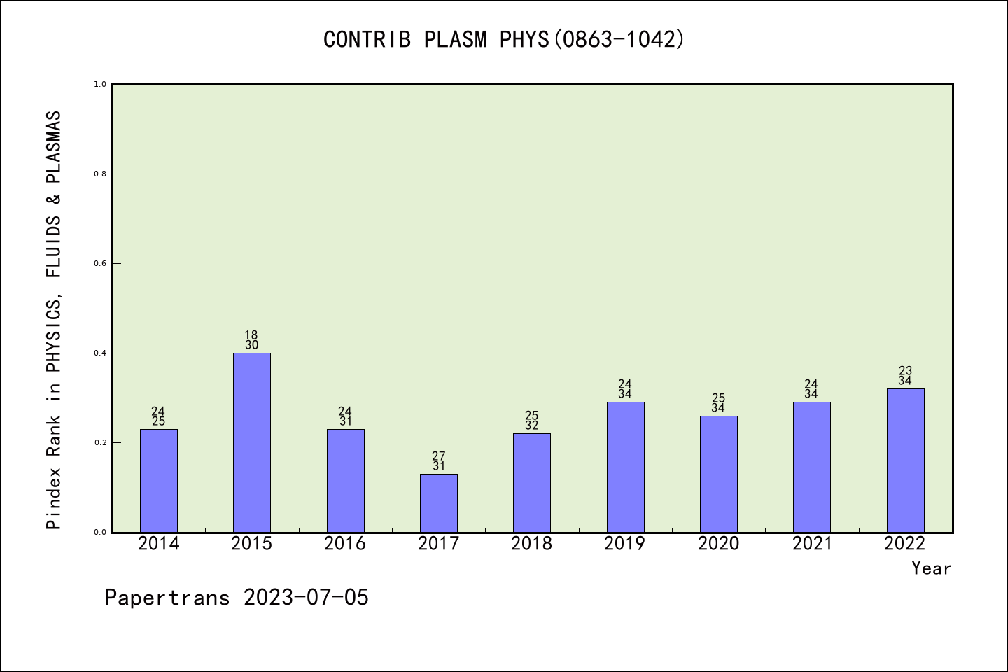 CONTRIBUTIONS TO PLASMA PHYSICS派博系数(Pindex)学科排名@SCIE物理学-流体与等离子体