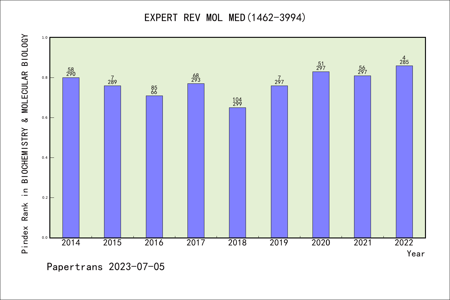 EXPERT REVIEWS IN MOLECULAR MEDICINE派博系数(Pindex)学科排名@SCIE生物化学与分子生物学