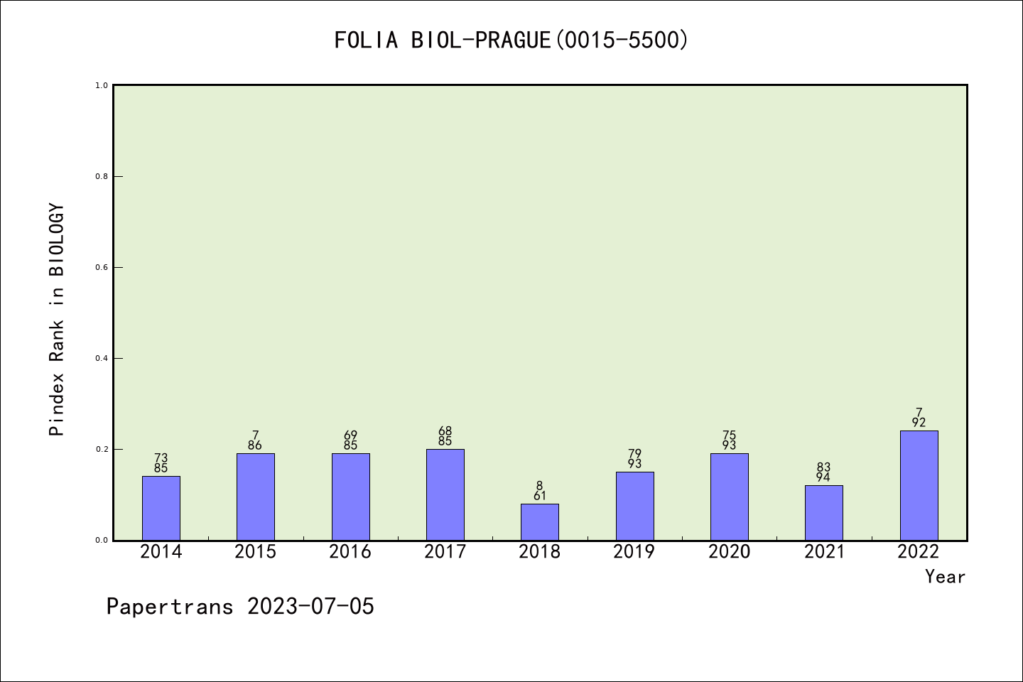 FOLIA BIOLOGICA派博系数(Pindex)学科排名@SCIE生物学
